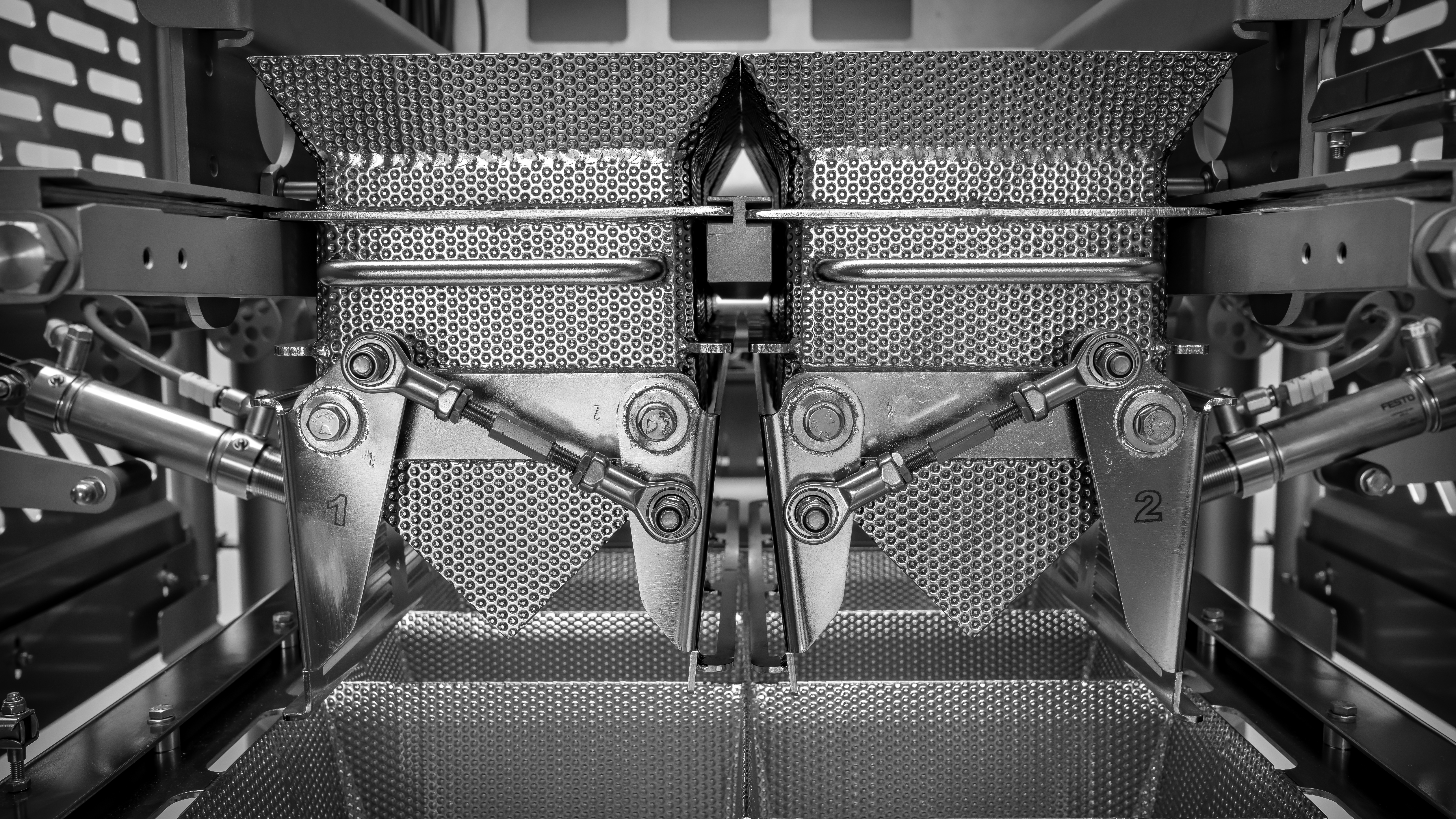 The multi-head scale is fed fully automatically and the distribution system can be removed from the side of the line without tools for optimum cleaning. In addition, the entire line has a hygienic design. Low downtimes, in particular due to the rapid cleaning of the line and the weighing hoppers and dosing chutes using a washing wall developed by Gröneweg, enable a highly efficient and optimised production process.